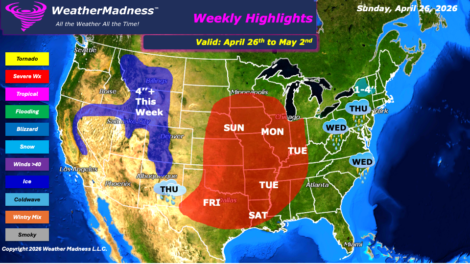 This week’s weather will focus a dynamic system that will drive conditions beginning Sunday, when severe weather is expected to develop across the Plains. This threat will shift into the Midwest on Monday, where all hazards will be in play, including a heightened risk for tornadoes. By Tuesday, the focus for strong to severe storms transitions into the Ohio and Mississippi Valley, maintaining a broad corridor of unsettled and potentially dangerous conditions.