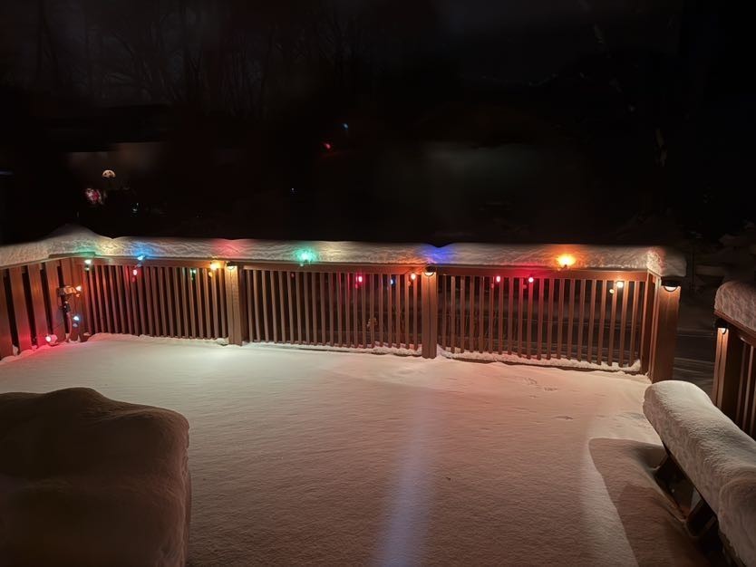 Christmas lights from my childhood. C9 iridescent bulbs. i always put one set out on my deck. yes, they eat a lot of energy, but they look great when it snows