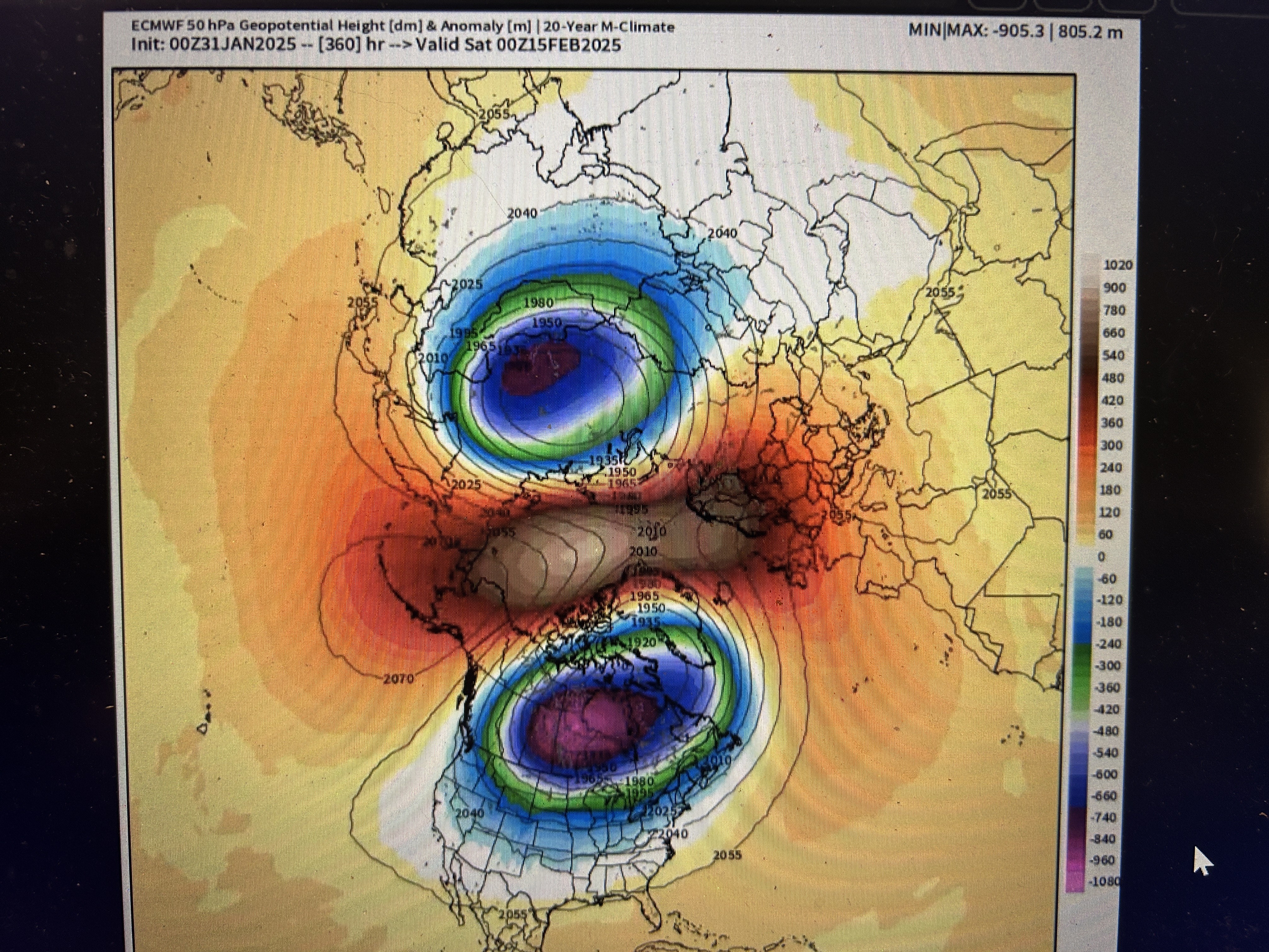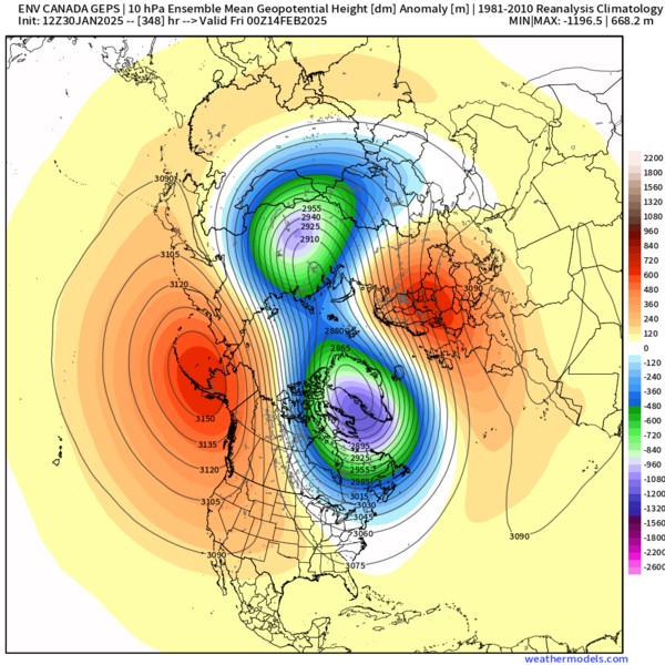 Credit to: @Superchri90 · The last split similar to this was 40 years ago, in the famous winter of January 1985! Where a strong W2 pattern led to a PV split on December 30, 1984 with almost immediate effects bringing very cold and a lot of snow to Europe, but also to the USA! Very rare events!