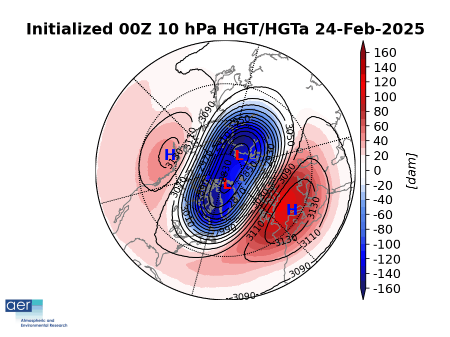 The imprint of the two stretched polar vortex (PV) events can be easily seen in the February surface temperature anomalies so far (see Figure).